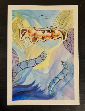 I picked a scrap piece (the apples) that really spoke to me and glued it down once the paint dried. Finally, I went in with a black pen and added inked details where I wanted the piece to pop.