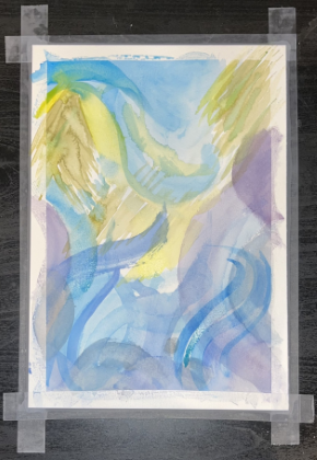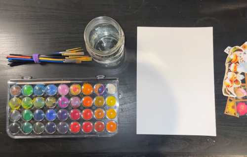 I found thick paper that can hold the paint, some watercolors, brushes, clean water, pens, glue, and scraps I felt inspired to incorporate. I also taped down my paper to keep it still while I work. This will help to give a clean, defined edge to the paint.